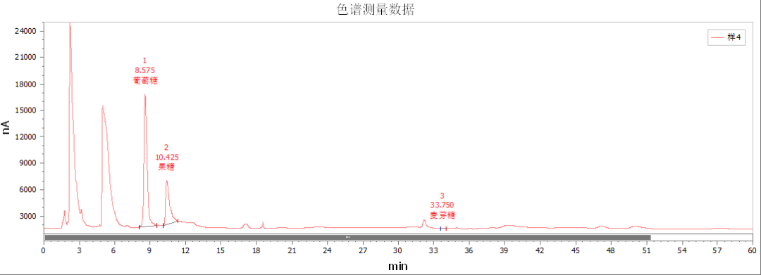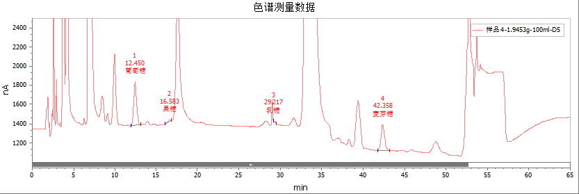新标准要求明确标示糖含量 哪种检测方法能精准检测糖含量呢? GB 5009.8-2023《食品安全国家标准食品中果糖、葡萄糖、蔗糖、麦芽糖、乳糖的测定》明确了食品中五种糖的检测方法,其中离子色谱法作为第二法适用于全品类食品果糖、葡萄糖、蔗糖、麦芽糖、乳糖的测定,是应用范围最广的检测方法。 优米解决方案 仪器配置: CIC-D200E糖检测专用仪 ✅高通量自动进样器 60、120位进样器可选,样品处理量多,效率更高; 全定量、部分进样、无损进样等多种进样方式可选,满足不同用户使用场景。 ✅电化学检测单元 直流、脉冲、积分三种模式可选,选择更灵活; 内置柱温箱,连接死体积更小,出峰分辨率更佳; ✅高效梯度混合泵 多通路流路自动混合,精度高、易控制、更省心; 耐腐蚀,流路pH范围0~14,可适用多种有机溶剂,性能优异。 SH-CAC-200 色谱柱可以快速高效地分离单糖、双糖,具有理想的分离度;与脉冲安培检测 (PAD) 相结合,在高 pH 条件下可进行高分辨率的分离,无需衍生化。 前处理方法: ①称取试样2g(精确至0.001 g)于100 mL比色管中,加入约50 mL 50℃~60℃热水,涡旋或搅拌 ②待样品充分溶解,加入2 mL乙酸溶液,涡旋混匀,超声30 min ③转移至100 mL容量瓶中并用水定容至刻度,混匀,静置20 min ④依次过0.45 μm水性滤膜针头过滤器和C18固相萃取小柱 色谱条件: 样品谱图: (标准溶液谱图 点击图片可放大查看) (样品1溶液谱图 点击图片可放大查看) (样品2局部放大谱图 点击图片可放大查看)